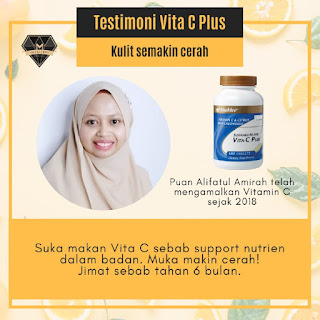 " Suka makan Vita C sebab support nutrien dalam badan. Muka makin cerah! Jimat sebab tahan 6 bulan". Puan Alifatul Amirah