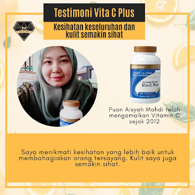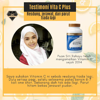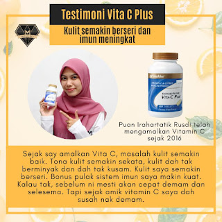 " Sejak saya amalkan Vita C, masalah kulit semakin baik. Tona kulit semakin sekata, kulit dah tak berminyak dan dah tak kusam. Kulit saya semakin berseri. Bonus pulak sistem imun saya semakin kuat. Kalau tak, sebelum ini mesti akan cepat demam dan selsema. Tapi sejak amik Vitamin C, saya dah susah nak demam". - Puan Irahartatik Rusdi
