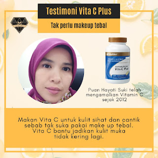 " Makan Vita C untuk kulit sihat dan cantik sebab tak suka pakai make up tebal. Vita C bantu jadikan kulit muka tak kering lagi". - Puan Hayati Suki