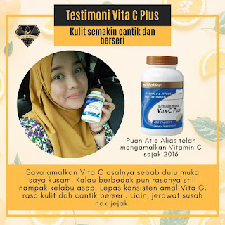 " Saya amalkan Vita C asalnya sebab dulu muka saya kusam. Kalau berbedak pun rasanya still nampak kelabu asap. Lepas konsisten amal Vita C, rasa kulit dah cantik berseri. Licin, jerawat susah nak jejak". Puan Atie Alias